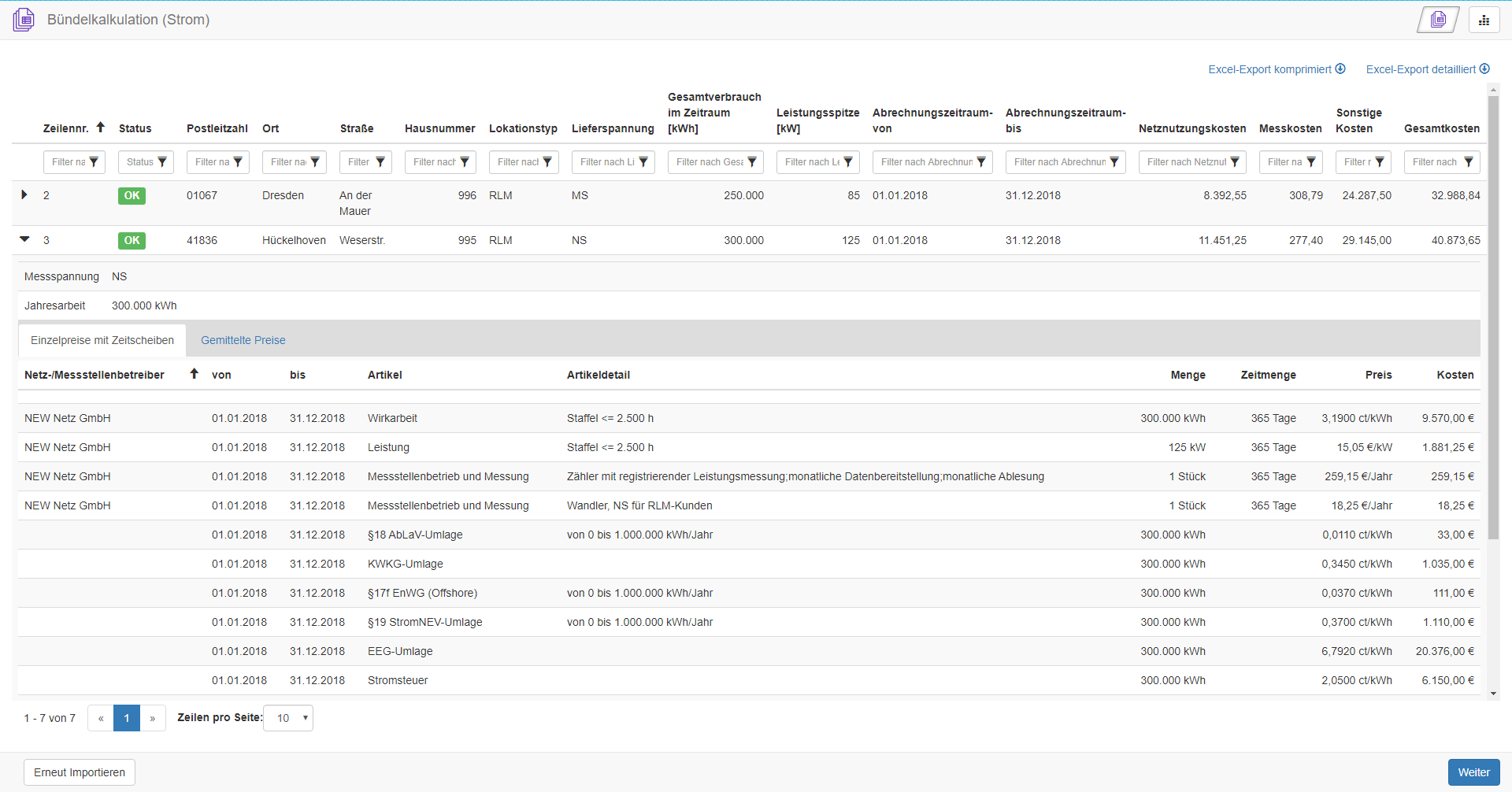 Nach dem Import der Bündeldatei werden die enthaltenen Daten formal und fachlich validiert. Eventuelle Abweichungen werden gekennzeichnet, sodass Sie die Möglichkeit haben, die Vorlage gezielt anzupassen und erneut zu importieren. Sobald die Berechnung des Bündels beginnt, werden der zuständige Netzbetreiber und das vorhandene Netz für jede Marktlokation ermittelt. Die App gibt anschließend alle dazugehörigen Kostenkomponenten aus. Als Ergebnis erhalten Sie die Kosten für die einzelnen Marktlokationen in tabellarischer Form und nach allen relevanten Positionen aufgeschlüsselt dargestellt.