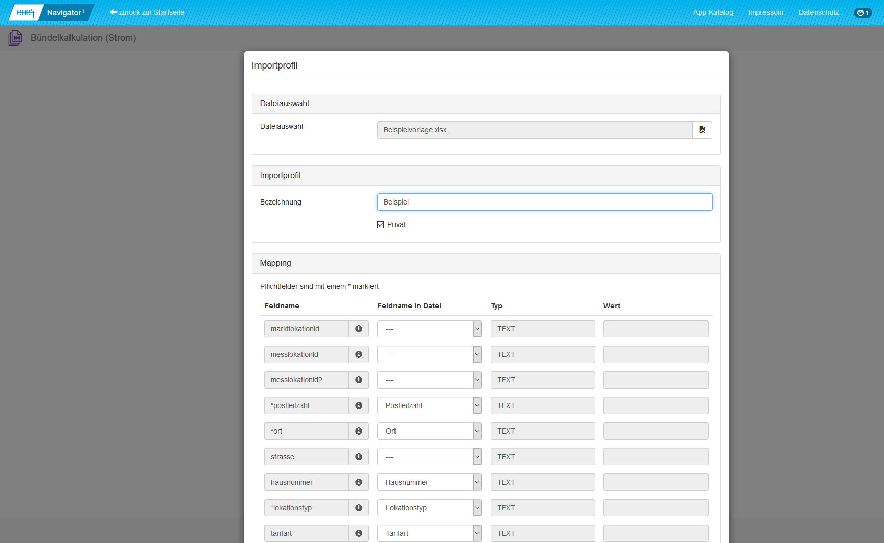 Die Bündelkalkulation (Strom) bietet Ihnen absolute Flexibilität in den Möglichkeiten, Ihre Daten zu importieren. Sie können für Ihr Tagesgeschäft beliebig viele Importprofile anlegen. Damit haben Sie die Möglichkeit, Ihre individuelle Datengrundlage im XLSX- oder CSV-Format in die App zu übernehmen. Eingabeparameter wie Straße, Hausnummer oder Postleitzahl werden dabei flexibel entsprechend Ihrer Vorgabedateien verarbeitet. Mithilfe eines passenden Mappings lassen sich die Spaltenbezeichnungen Ihrer Importdatei den dazugehörigen Zielfeldern des ene't Navigator® zuordnen. So können Sie für praktisch jede eingesetzte Quell-Datenstruktur ein Importprofil anlegen und zukünftig bequem Ihre Daten aus vorangehenden Prozessschritten zur Weiterverarbeitung in die Bündelkalkulation übernehmen. Darüber hinaus haben Sie die Möglichkeit, frei definierbare Felder für nicht berechnungsrelevante Zusatzinformationen (wie z. B. Kundennummern) zu nutzen.