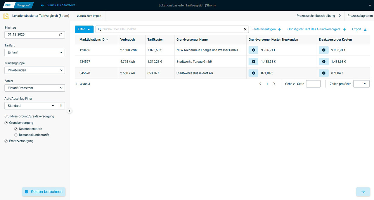 Kernfunktion der App Lokationsbasierter Tarifvergleich (Strom) ist es, eine Auswahl an Marktlokationen mit unterschiedlichen Verbräuchen in ein Verhältnis zu den Grundversorgungsprodukten sowie zu beliebigen Konkurrenzprodukten zu stellen. Hierbei können bis zu fünfzigtausend Lieferstellen gleichzeitig betrachtet werden.