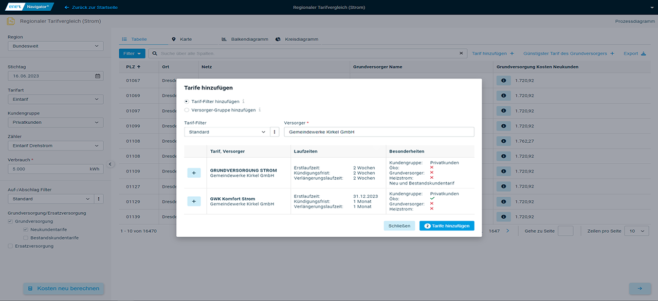 Die App Regionaler Tarifvergleich (Strom) bietet die Option, dem Vergleich weitere Produkte hinzuzufügen. Über eine Versorgersuche werden Tarife ermittelt, deren Charakteristika in Abhängigkeit der getätigten Eingaben vorgefiltert wurde. Zusätzlich kann mithilfe einer integrierten Funktion zur Definition von Tariffiltern festgelegt werden, welche Kriterien Vergleichstarife erfüllen müssen, um im Vergleich berücksichtigt zu werden.